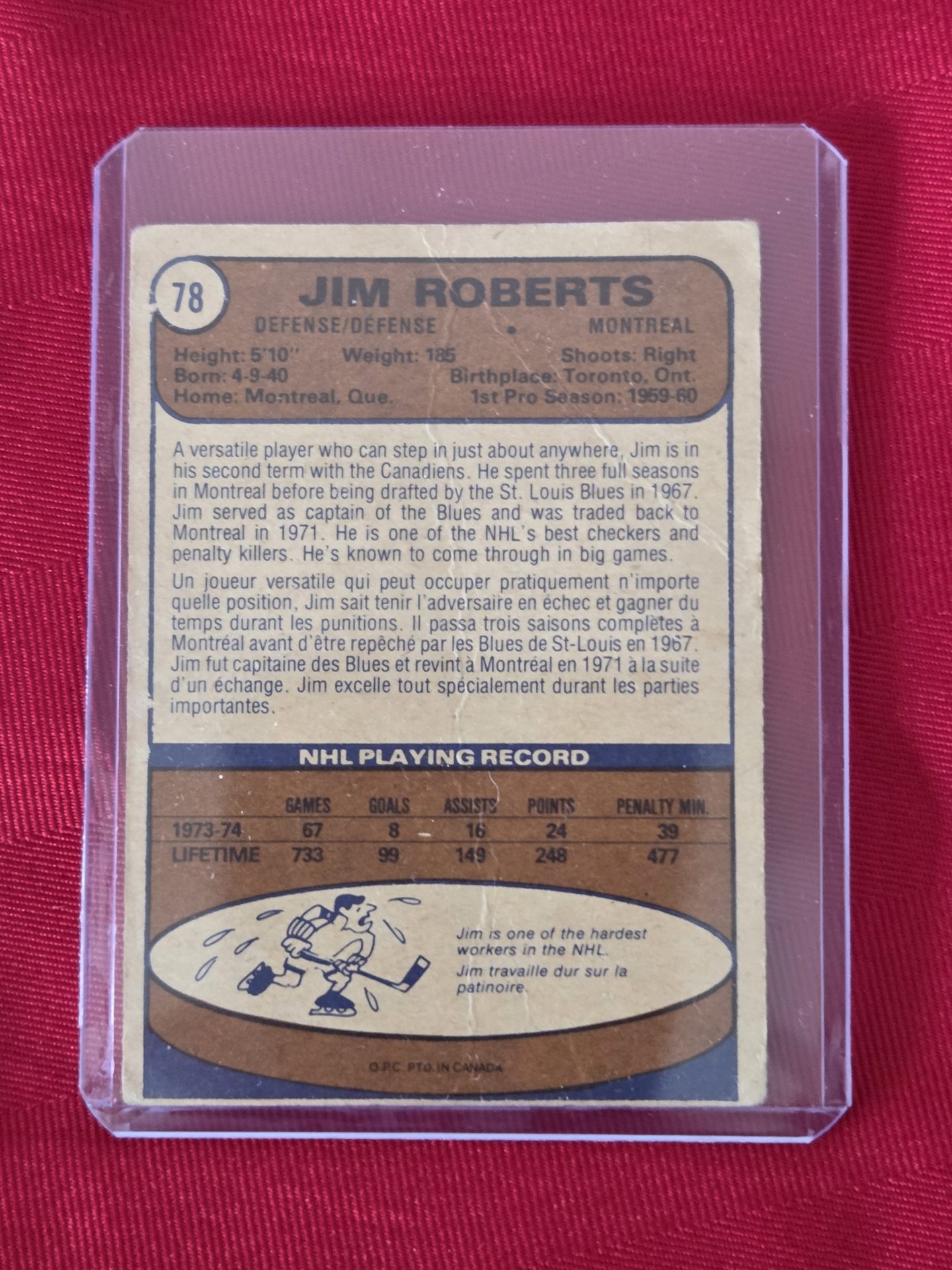 RARE, VINTAGE, 1974 OPEE CHEE, JIM ROBERTS, MONTREAL CANADIENS HOCKEY CARD!!!
