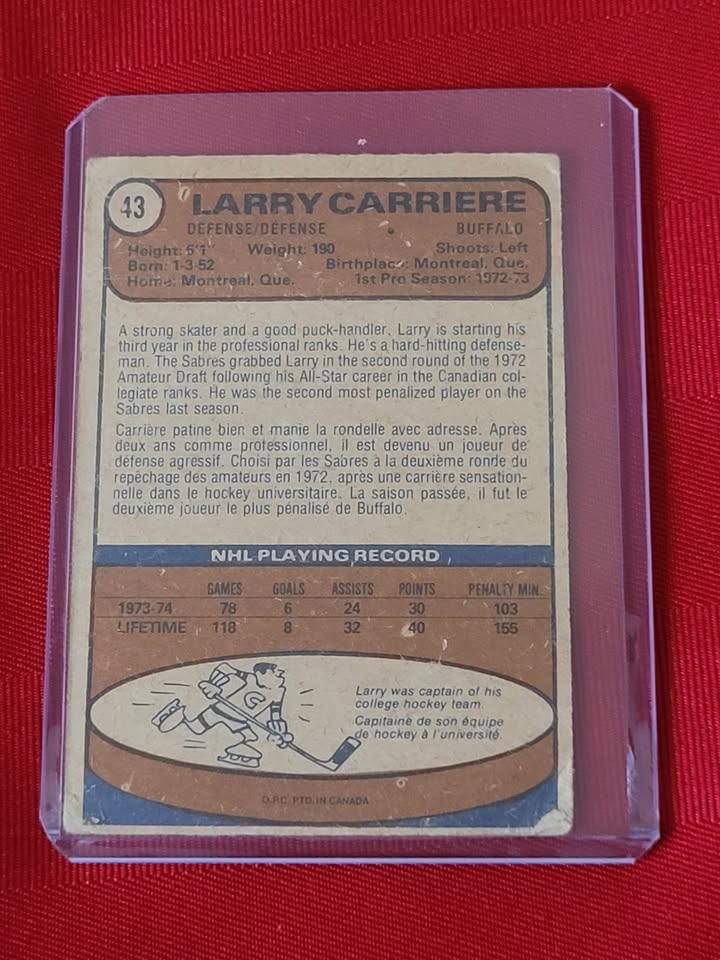 RARE, VINTAGE 1974 O PEE CHEE, LARRY CARRIERE, BUFFALO SABRES HOCKEY CARD!!!