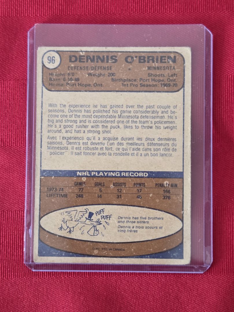 RARE, VINTAGE, 1974 OPEE CHEE, DENNIS O’BRIEN, MINNESOTA NORTH STARS HOCKEY CARD!!!